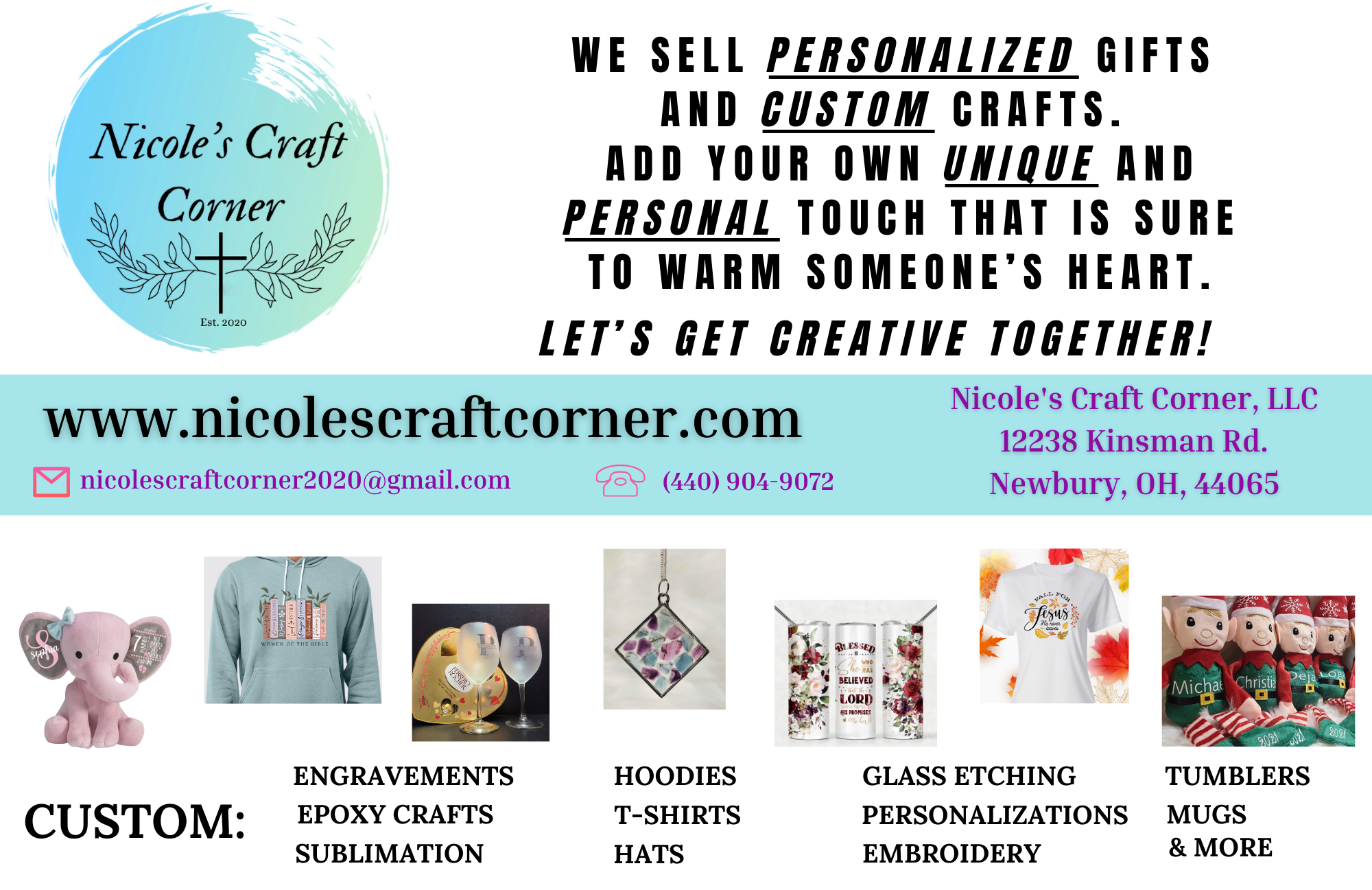 We specialize in making Personalized and Custom Gifts, Crafts, T-shirts, Hoodies, Tumblers, Mugs, Serving Trays, Gift Baskets, Business Advertising Merchandise and So much more!