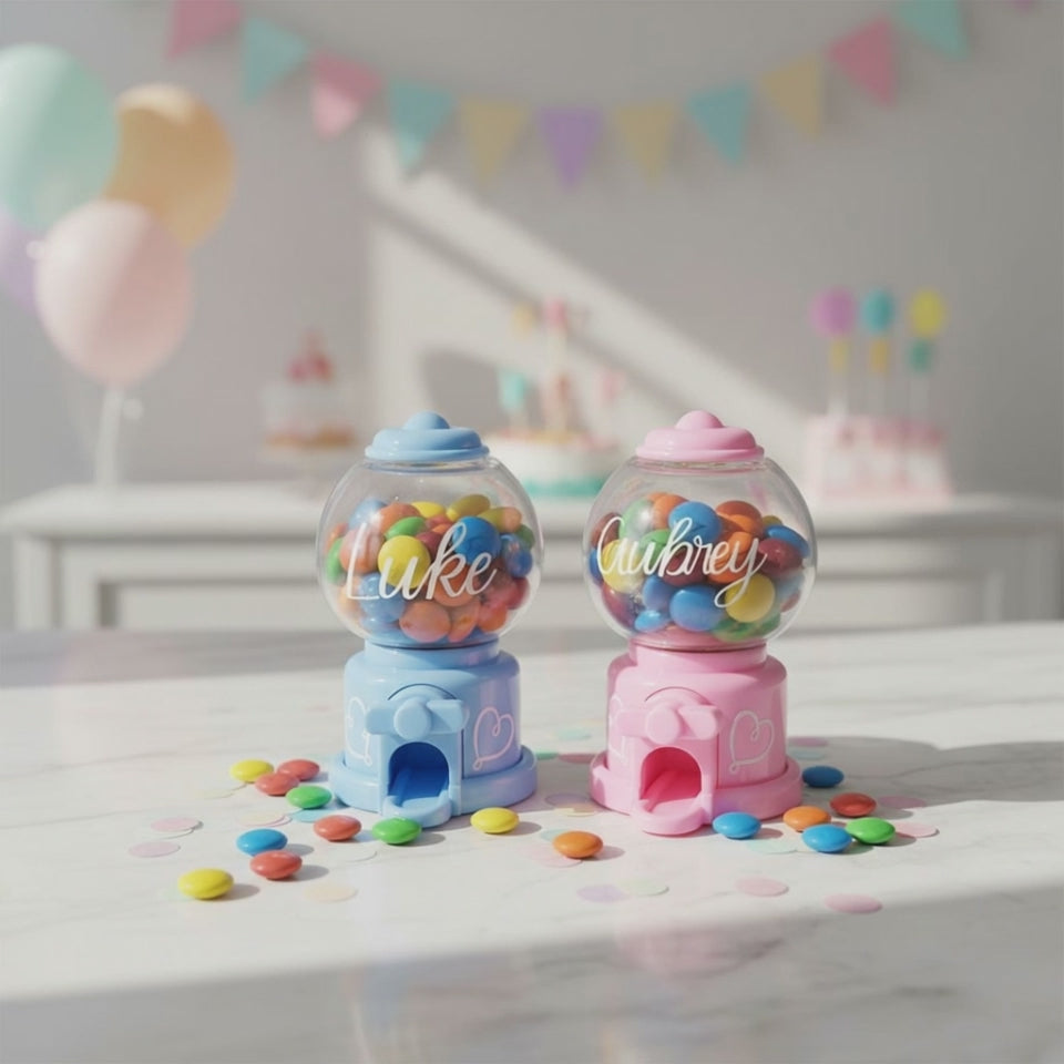 Add a sweet and stylish touch to any celebration with our personalized miniature candy dispensers! Perfectly sized for party favors (4" tall x 2 & 1/2" wide), these charming dispensers are both decorative and functional, guests will love taking them home. Designed with a classic gumball-machine look, these favors double as adorable keepsakes long after the candy is gone.